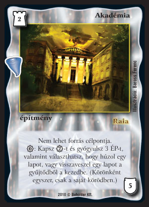 Akadémia (8): A látszat ellenére, nem feledkeztünk meg az épületpakliról sem, kapnak erősítést ők is. Elsőre talán érthetetlen az Akadémia, hiszen drága is, lassú is... Mit akarunk mi ettől? Nos annyit segíthetek, hogy a jövőben jön ki olyan lap, melynek segítségével elég könnyen aktívan rakhatjuk ki. Talán nem árulok el nagy műhelytitkot, ha megmondom, hogy ezen kiegészítő lapjait az év végi nagy kiegészítő lapjaival együtt teszteltük, így néhány lap ereje a későbbiekben megjelenő más lapokhoz lett bemérve. De addig se keseredjünk el, simán ki lehet vágni akár az első körben is az Akadémiát egy Szellemszolga segítségével, és akkor már a második körtől kezdve termelheti nekünk a tápot.