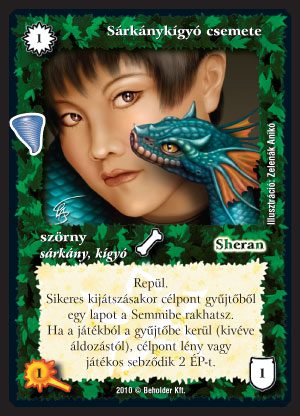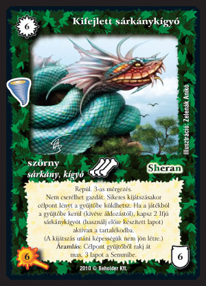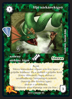 Ifjú sárkánykígyó (8): Ez már jobban tetszik! Olcsóbb és gyakrabban fog valóban zavaró lapot leszedni. A belőle kipottyanó kicsi kígyócska is hasznos jószág; sok mindenre használható (feláldozhatjuk valaminek, építkezik, blokkol, lényirtásként vagy kivégzésként hasznosítjuk).