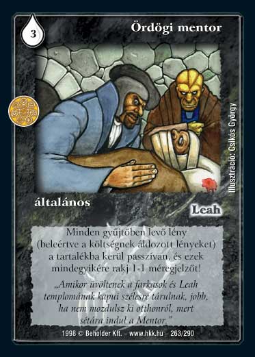 Kiadás: Ezüsthajnal, Túlélők Földje Gyakoriság: ritka Lapszín (isten): Leah Típus: általános Szöveg: Minden gyűjtőben levő lényt a gazdája a tartalékjába rak (ideértve a költség kifizetésekor feláldozott lényeket), passzívan, és ezek mindegyikére rak egy-egy méreg jelzőt. Szinesítő szöveg: "Amikor üvöltenek a farkasok és Leah templomának kapui szélesre tárulnak, jobb, ha nem mozdulsz ki otthonról, mert sétára indult a Mentor." Illusztráció: Csikós György