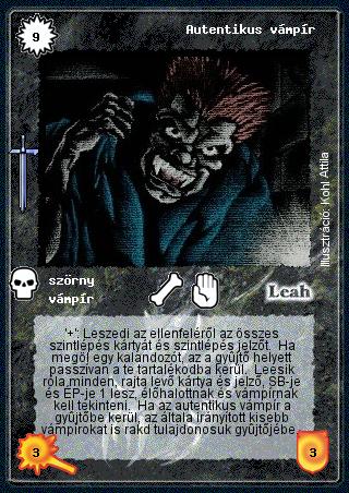 Kiadás: Hőskorszak Gyakoriság: ritka Lapszín (isten): Leah Típus: szörny Altípus: vámpír Szöveg: '+': Leszedi az ellenfeléről az összes szintlépés kártyát és szintlépés jelzőt. Ha megöl egy kalandozót, az a gyűjtő helyett passzívan a te tartalékodba kerül. Leesik róla minden, rajta levő kártya és jelző, SB-je és ÉP-je 1 lesz, élőhalottnak és vámpírnak kell tekinteni. Ha az autentikus vámpír a gyűjtőbe kerül, az általa irányított kisebb vámpírokat is rakd tulajdonosuk gyűjtőjébe. Illusztráció: Kohl Attila