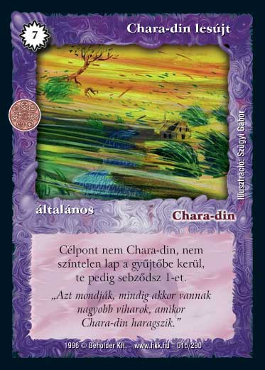 Kiadás: Chara-din visszatér, Túlélők Földje Gyakoriság: gyakori Lapszín (isten): Chara-din Típus: általános Szöveg: Célpont nem Chara-din, nem színtelen lap a gyűjtőbe kerül, te pedig sebződsz 1 ÉP-t. Szinesítő szöveg: "Azt mondják, mindig akkor vannak nagyobb viharok, amikor Chara-din haragszik." Illusztráció:
