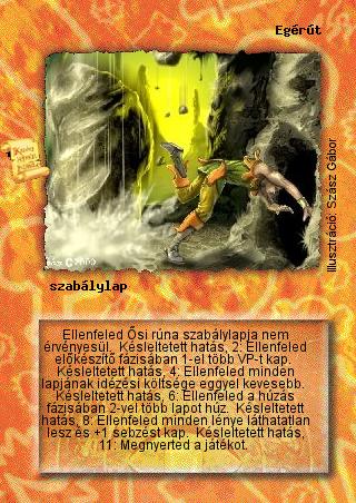 Kiadás: Rúvel hegy Gyakoriság: ultra ritka Lapszín (isten): Nincs Típus: szabálylap Szöveg: Ellenfeled Ősi rúna szabálylapja nem érvényesül. Késleltetett hatás, 2: Ellenfeled előkészítő fázisában 1-el több VP-t kap. Késleltetett hatás, 4: Ellenfeled minden lapjának idézési költsége eggyel kevesebb. Késleltetett hatás, 6: Ellenfeled a húzás fázisában 2-vel több lapot húz. Késleltetett hatás, 8: Ellenfeled minden lénye láthatatlan lesz és +1 sebzést kap. Késleltetett hatás, 11: Megnyerted a játékot. Illusztráció: Szász Gábor