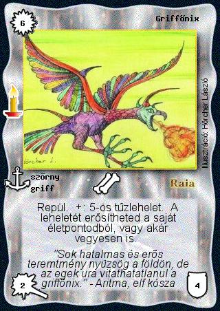 Kiadás: Múltidéző Gyakoriság: ritka Lapszín (isten): Raia Típus: szörny Altípus: griff Szöveg: Repül. +: 5-ös tűzlehelet. A leheletét erősítheted a saját életpontodból, vagy akár vegyesen is. Szinesítő szöveg: "Sok hatalmas és erős teremtmény nyüzsög a földön, de az egek ura vitathatatlanul a griffőnix." - Aritma, elf kósza Illusztráció: Hörcher László