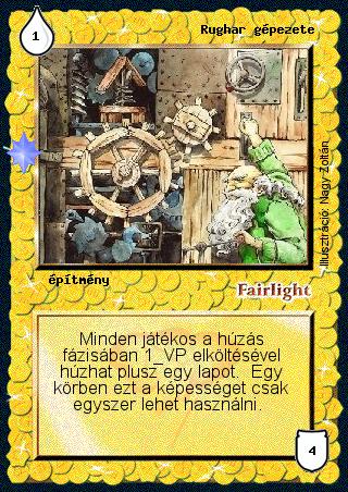 Kiadás: Ezüsthajnal Gyakoriság: nem gyakori Lapszín (isten): Fairlight Típus: építmény Szöveg: Minden játékos a húzás fázisában 1 VP elköltésével húzhat plusz egy lapot. Egy körben ezt a képességet csak egyszer lehet használni. Illusztráció: Nagy Zoltán