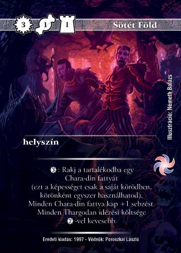 Kiadás: Létsíkok, Védnök 2023 Gyakoriság: nem gyakori Lapszín (isten): Színtelen Típus: helyszín Szöveg: 3 VP: Rakj a tartalékodba egy Chara-din fattyát (használj előre kikészített lapot, ez nem jelzőnek, hanem lapnak számít, a gyűjtőbe is bekerülhet). Ezt a képességet csak a saját körödben, körönként egyszer használhatod. Minden Chara-din fattya kap +1 sebzést. Minden Thargodan idézési költsége 2 VP-vel kevesebb. Illusztráció: Fischer Tamás